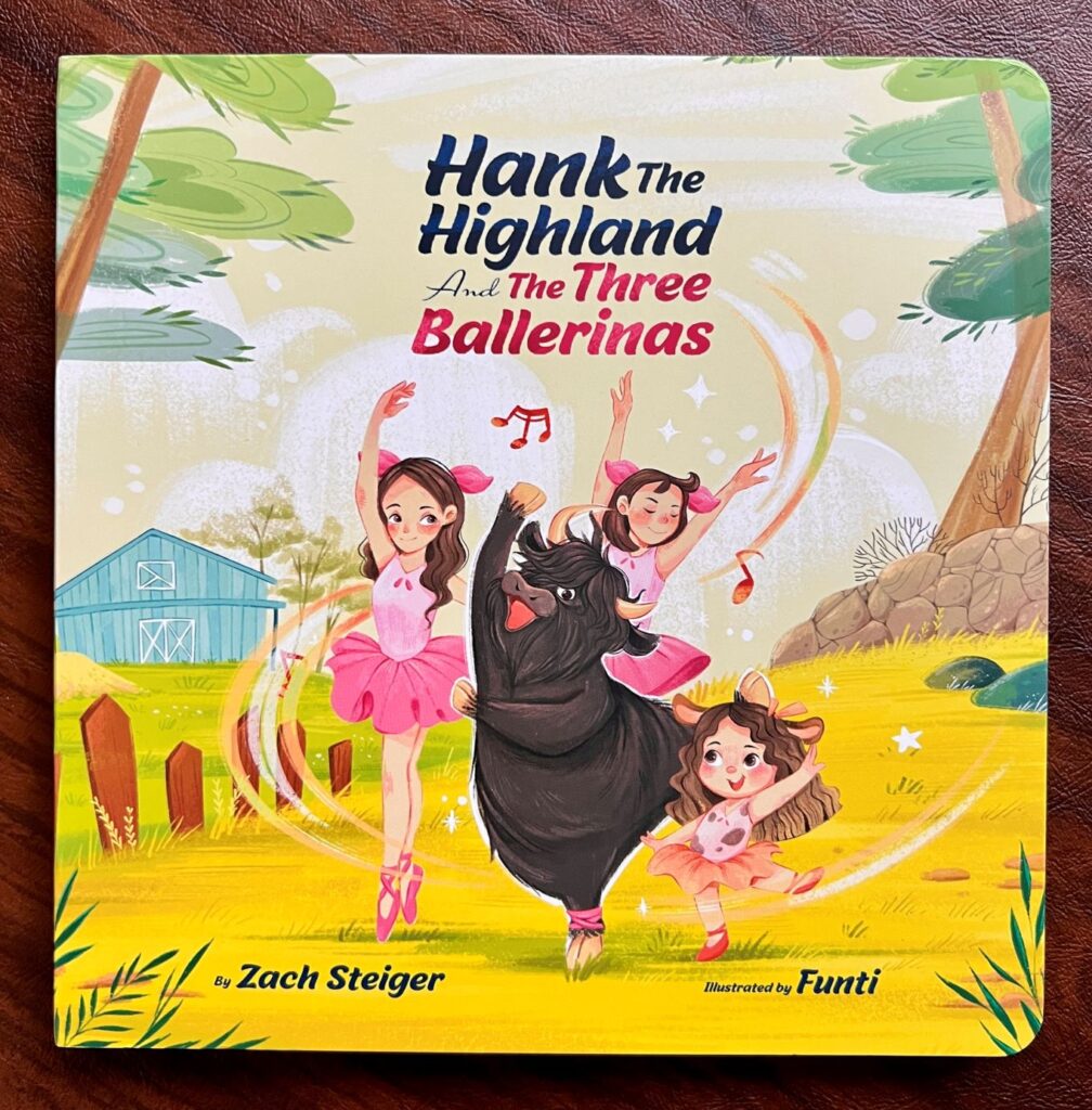 As he began thinking about the idea and exploring the concept of writing a book, it gradually started to grow on him. The first spark of inspiration came while he was out feeding the farm animals. As he pondered a little deeper, the main character emerged, Hank, his rescued Highland bull, now a year and a half old. With more thought given to the storyline, he decided he wanted to incorporate his three girls and their shared love of dance, which led to the creation of the three ballerina characters. “They are not identical to my girls, but it adds another layer to the book and excitement for my daughters,” Steiger said.