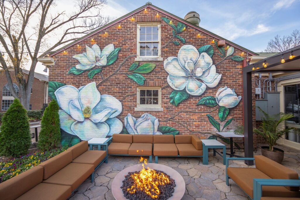 From the moment you arrive, you’ll sense the timeless charm of Mere Bulles. The historic mansion sets the tone for an experience that blends the elegance of a bygone era with the warmth and energy of modern Southern hospitality. Inside, each dining room offers a distinctive setting—from quiet, romantic nooks to open, airy spaces perfect for celebrations. The ambiance is elevated further by a beautiful back patio with a fire pit, ideal for sipping wine on cool evenings or enjoying brunch in the fresh air.